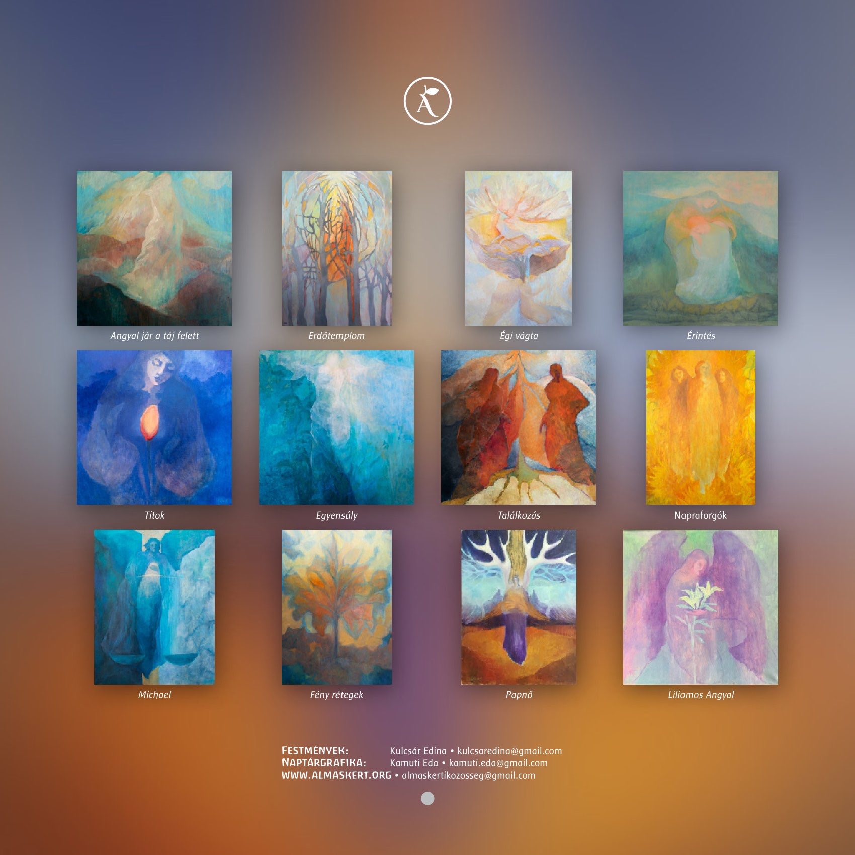 Szeretettel ajánljuk az Almáskert 2026-os naptárát! Idén egy különleges kiadással készültünk, Kulcsár Edina festőművész támogat minket azzal, hogy olajfestményeit használhatjuk a hónapok illusztrációjaként: „Kisgyerekként leginkább rajzolni szerettem, így amikor elképzeltem magam felnőttként, színes ceruzát láttam a kezemben. Rajzoltam is sokat, meséket, verseket illusztráltam, majd egyszer csak egy szentendrei műteremben festősegéd lettem. A színek rabul ejtettek, a ceruzát ecsetre cseréltem. Nem egyszerű feladat ma festőnek lenni, de hálás vagyok, hogy az lehetek. ” …” A képek hatnak ránk … Festeni felelősség. Ezzel a tudattal keresem a szépet, a szépen keresztül a harmóniát…a békét.”